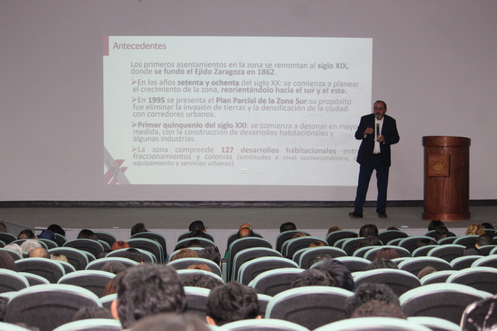 En su exposición, el doctor Roberto Mora presentó un panorama histórico del crecimiento de Ciudad Juárez, desde sus orígenes agrícolas hasta la consolidación del modelo industrial con la llegada del programa maquilador, que detonó una expansión acelerada de la mancha urbana hacia el suroriente.
