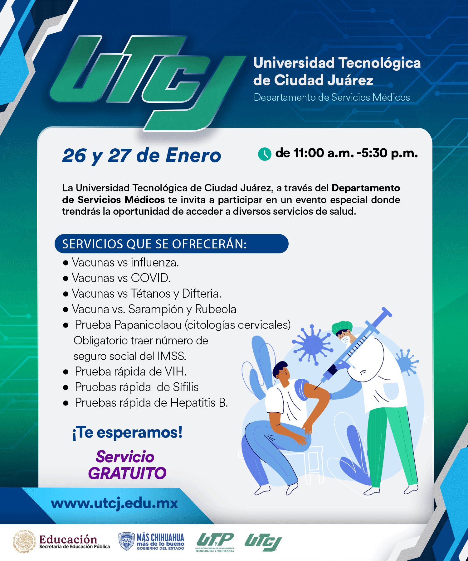 La Universidad Tecnológica de Ciudad Juárez, a través del Departamento de Servicios Médicos te invita a participar en un evento especial donde trendrás la oportunidad de acceder a diversos servicios de salud.