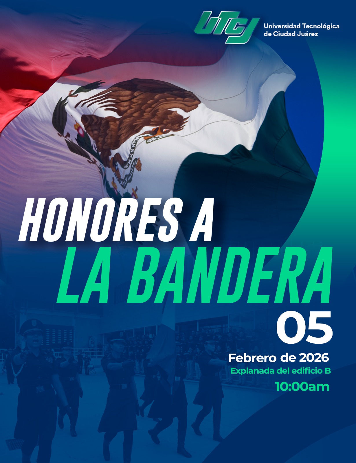 La Universidad Tecnológica de Ciudad Juárez invita cordialmente a toda la comunidad universitaria a participar en la ceremonia de Honores a la Bandera, que se llevará a cabo el próximo 5 de febrero, en conmemoración del Día de la Constitución Mexicana.